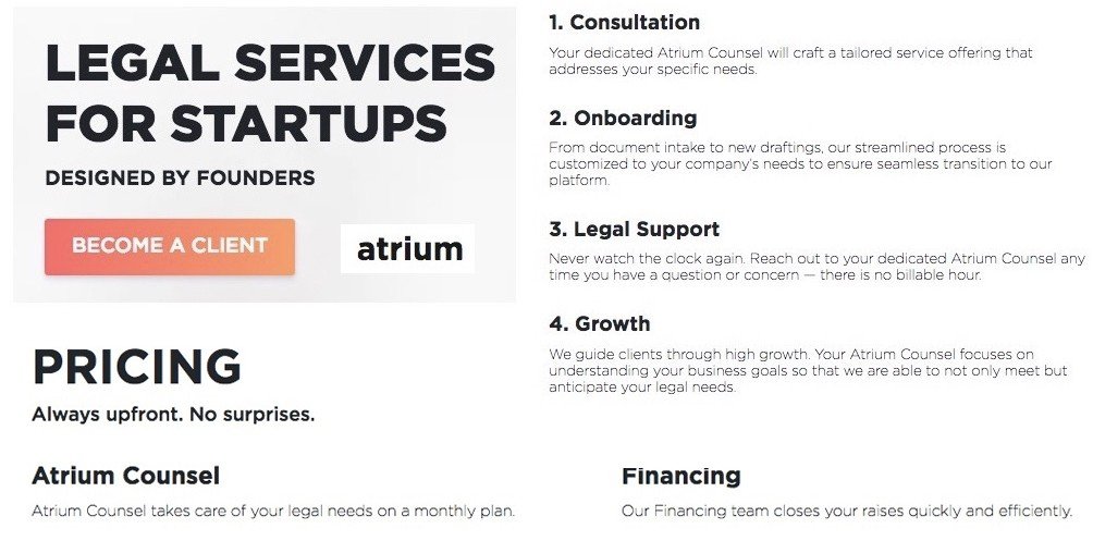 Augie Rakow ve BeBe Chueh’in de kurucu ortaklar arasında olduğu Atrium, girişimlere hukuksal alanda hizmet veren bir teknoloji platform. Atrium, hem teknolojisiyle hem de fiyatlandırma stratejisiyle geleneksel avukatlık hizmetlerinden ayrılıyor. Atrium Counsel hizmetiyle aylık net bir ücret tarifesi sunan girişim, Atrium Financings paketiyle yatırım alma konusundaki süreçlerde yine şeffaf bir şekilde ücretlendirme yapıyor.