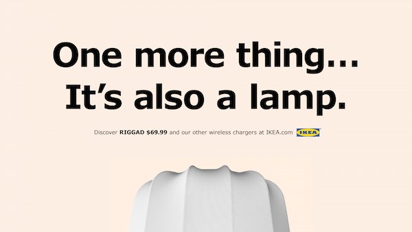 Ikea, kablosuz şarj cihazlarını tanıtmak için Apple'ın yeni telefonlarından iPhone 8'in satışa sunulduğu günü kullandı. Üstelik sadece bu günü kullanıp reklam yapmakla da yetinmedi ve Apple'ın en bilindik sloganlarını da kendi reklam formatı için yeniden uyarladı ve ortaya oldukça başarılı bir iş çıktı.