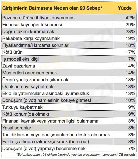 Eğer bir girişimciyseniz veya olmak istiyorsanız aşağıdaki tablodan önemli dersler çıkarabilirsiniz. Özellikle ilk 3 nedenin iyice sorgulanmasında fayda var. Eğer kaçırdıysanız girişimleri kapanma nedenleriyle listeleyen Startup Graveyard'a da (İngilizce) göz atabilirsiniz.