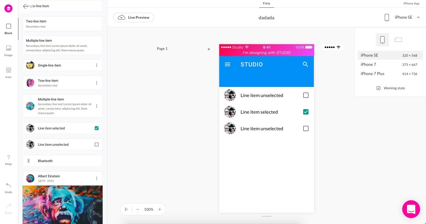 Mobil tarafta sadece iPhone'a özel tasarım yapmanıza izin veren Studio Design, iOS'a uygun temiz tasarımlar yapmanızı mümkün kılıyor. Model olarak da iPhone SE, iPhone 7 ve iPhone 7 Plus'ı temel alıyor. Mobile duyarlı tasarımlar yapmanızı sağlayan Studio Design'ın bir özelliği de canlı link üzerinde yaptığınız tasarımı görebilmeniz. Yani soyut fikrinizi hızlı ve güzel bir şekilde somutlaştırıp çevrenizle paylaşabiliyorsunuz.