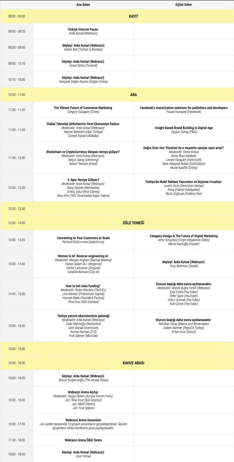 Ana Salon, Dijital Salon, Startup Lounge ve Workshop olmak üzere 4 alanda düzenlenecek olan Webrazzi Summit 2017'yi şimdiden planlamanızda fayda var. Paralel oturumlar, 50'den fazla girişimci networking derken başınız dönmesin :)