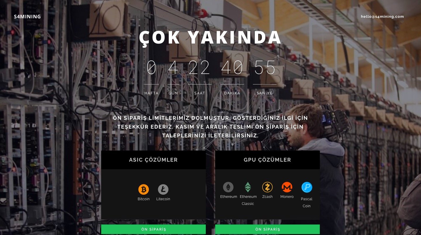 ASIC çözümler ile Bitcoin ve Litecoin, GPU çözümleri ile de Ethereum, Ethereum Classic, Zcash, Monero ve Pascal Coin için hizmet verecek olan s4mining, 5 gün sonra kullanıma sunulacak. Oldukça verimli bir ön sipariş süreci geçirdiklerini de belirten Selçuk Saraç, Aralık sonuna kadar tüm stoklarının tükendiğini de ekledi.