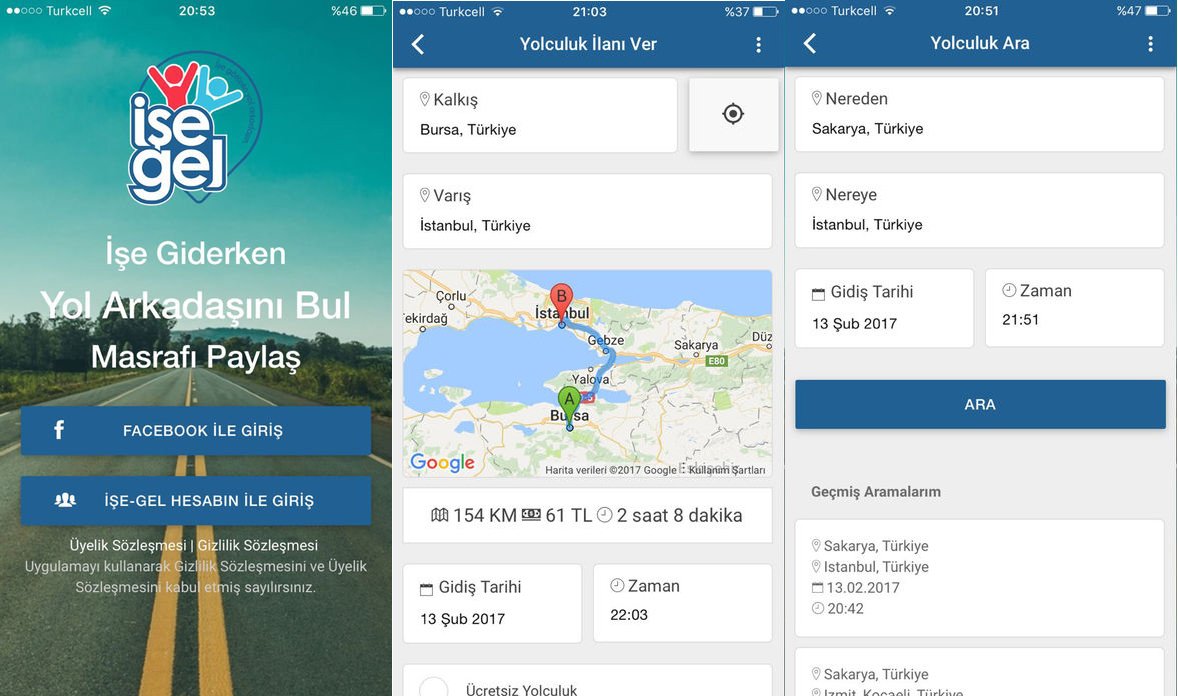 Bir yolculuk paylaşım uygulaması olarak karşımıza çıkan İşe-Gel, işe giderken araç veya yol arkadaşı bulmanıza olanak tanıyor. Aynı veya yakın iş yerlerinde işine arabayla giden kullanıcıların boş koltuklarını paylaşmasını imkan sağlayan İşe-Gel, hem yolculara hem de araç sahiplerine online yolculuk ilanı verme imkanı sunuyor.