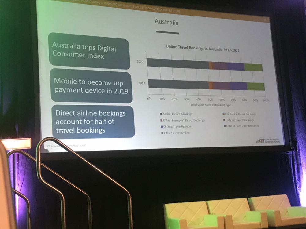 2017-2022 yılları arasındaki seyahat acentalarından yapılan tahmini online rezervasyonlarını ele alan Euromonitor'e göre 2019 yılında mobil aygıtların kullanımı en yükseğe ulaşacak. Rezervasyonları yapanların yarısının, havayolu şirketlerinden direkt uçak bileti satın almış olacağını da ekliyor. Örnek olarak Avustralya'nın çok tercih edilen havayolu şirketi Quantas Airlines'ı veren Evans, Quantas'ın Facebook gibi sosyal medya kanallarını müşterileriyle iletişim için çok etkili kullandığını, chatbot'lar ile yüzde 20 bir kullanım artışı görüldüğünü de ekliyor.