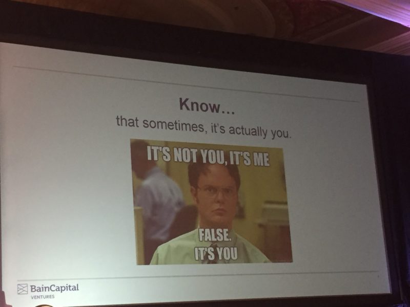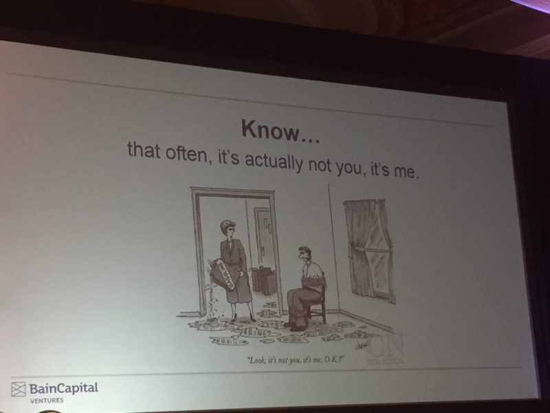 Her yatırım şirketinin bir ilgisi var, sizi kabul etmemeleri normal diyen yatırımcı sorun sende değil bende diyor. Ama sonraki slaytta bazı durumlarda sorunun girişimcide de olduğuna değiniyor.