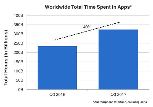 - Android uygulamalarında geçirilen süre yüzde 40 artışla 325 milyar saate yaklaştı. Üstelik bu istatistik Çin'li kullanıcıları kapsamıyor.