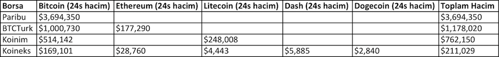 Göreceğiniz gibi Paribu, BTCTurk, Koinim ve Koineks arasında en çok kripto para birimiyle işlem yapan Koineks olmasına karşılık, sadece bitcoin işlemi gerçekleştiren Paribu 24 saatlik toplam hacimde yaklaşık 3.7 milyon dolar ile en yüksek değerlere ulaşan borsa olarak karşımıza çıkıyor.