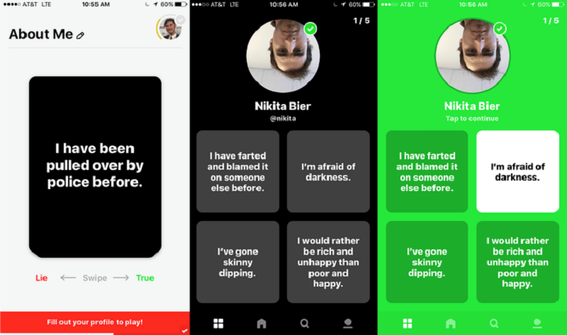 Lies'ı indirdiğinizde ilk olarak rehberinizdeki kişileri uygulamaya aktarıyorsunuz ardından kendiniz hakkında size sorulan soruları cevapları "Evet" ve "Hayır" olmak üzere Tinder vari bir şekilde sağa ya da sola kaydırıyorsunuz. Bütün bunlar bittikten sonra da tbh tarzında karşınıza çıkan 4 seçenekte arkadaşlarınız hakkındaki bir takım tanımları görüyor ve bunlardan hangisinin gerçek olduğunu tahmin etmeye çalışıyorsunuz. Bu tanımlarda "Çıplak olarak yüzdüm." , "Kalabalıktan korkuyorum" ve "İlk randevumuzda birini öptüm." gibi birbirinden farklı bir çok cümle yer alabiliyor.