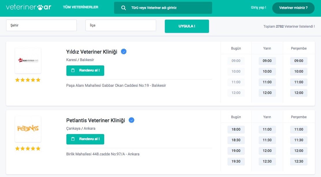Veteriner kliniklerinin ücretsiz sayfa oluşturmasına izin veren Veterinervar.com, aylık 50 TL abonelik ücretiyle randevu sistemi, kısa mesajla randevu tarihi hatırlatma, hasta kaydı tutma, hastalara kısa mesaj gönderme, çağrı merkezi ve içerik paylaşım gibi ek özellikler sunuyor.
