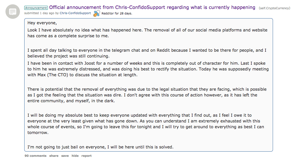 Son ICO dolandırıcılığı 347 bin dolar para toplamayı başaran, kripto paralar için CFD (kısaca, hisse senedi gibi varlıklara fiilen sahip olmadan alım-satım yapılmasına imkan sağlayan bir araç) hizmeti sunmayı hedefleyerek ICO yapan Confido.io projesinde meydana geldi. Reddit'te bu durumu düzeltmeye çalışan ve görünüşe göre uzaktan çalışarak Confido.io şirketine destek veren Chris isimli kişi ortalığı biraz daha karıştırdı.