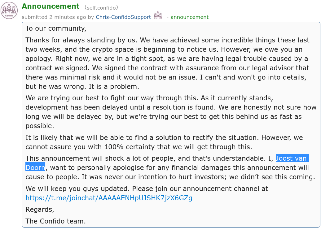 Reddit'te ilk olarak ekibin Telegram grubundan kopyaladığı bir şeyi yanlışlıkla Reddit'e paylaşan Chris sonra bu içeriği silerek daha farklı bir içerik paylaştı. İlk paylaşılan içerikte kurucu Joost van Doorn tarafından yazılmış bir özür mesajı bulunuyor ve bu mesaja göre, avukatlarının hukuki olarak bir problem teşkil etmeyeceğini belirttiği bazı yasal sorunlar nedeniyle ürünün geliştirilmesi durmuş ve yasal problemler çözüldükten sonra ürünü tamamlayarak kimsenin mağdur edilmeyeceği belirtiliyor. Fakat bu yasal sorunların kesin olarak aşılabileceğinden emin olmadıklarını da ekliyorlar.