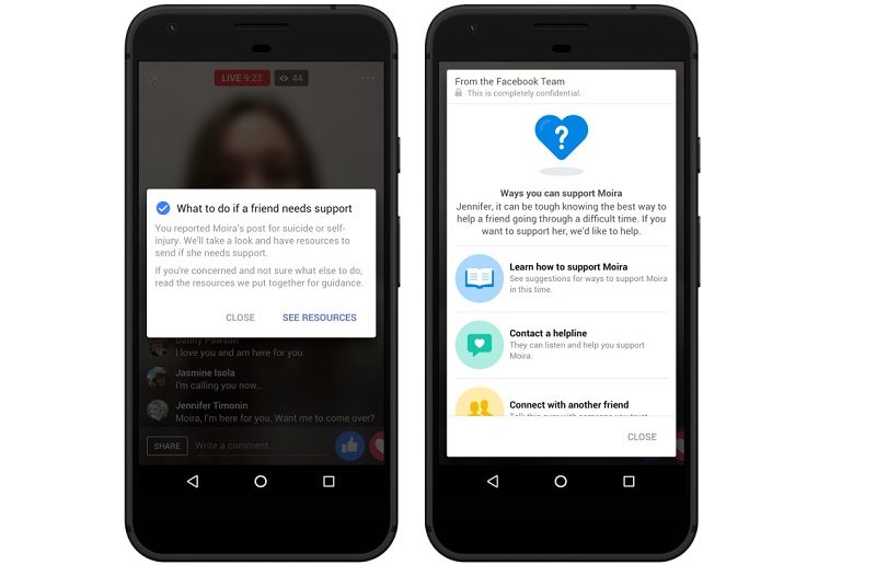 Tüm bu işlemlerin ardından Facebook araçları, intihar önleme hatları ve yakında yer alan yetkililerin telefon numaraları da dahil olmak üzere Facebook'un ortaklık yaptığı yerel dile sahip kaynaklar üzerinden kullanıcıya öneriler sunuyor. Moderatörler ise bu konuda çalışma yürüten ve duruma uygun şekilde müdahale edebilecek yetkin kişilere başvurarak intihar riski taşıyan kullanıcının konumunu paylaşmayı deneyebiliyor. Moderatörlerin bunun yerine kullanıcıya veya kullanıcıyla bu konuda konuşabilecek olan arkadaşlarına ruh sağlığına yönelik kaynaklar önermesi de mümkün. Ürün Yönetimi Başkan Yardımcısı Guy Rosen bu konuda "Hedeflerimizden biri de, ekibimizin kullanıcılara desteklediğimiz herhangi bir dilde dünya çapında cevap verebilmesini sağlamaktır." açıklamasında bulundu.