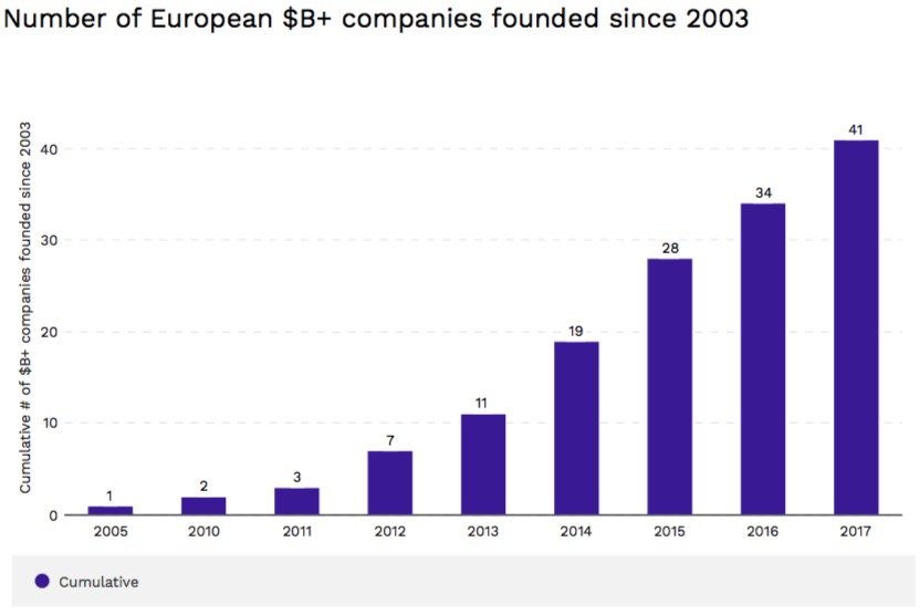 Milyar dolar değerlemeye ulaşan girişim sayında önemli bir artış olduğunu da gözler önüne seren rapor, 2017 yılında Avrupa'da en az 1 milyar dolar değerlemeye ulaşan 41 girişim olduğunu gösteriyor. Karşılaştırmak gerekirse 2015 yılında 28, 2016 yılında ise 34 girişim aynı başarıyı gösterebilmişti.