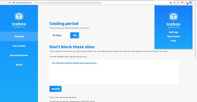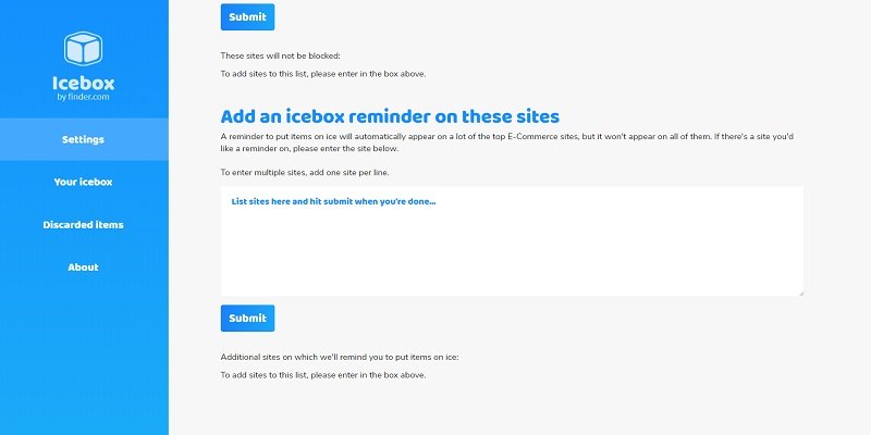 Icebox, almak istediğiniz ürünleri tekrar değerlendirmenizi sağlayan bir Chrome eklentisi. Bu eklentiyi çalıştırmadan önce, eklenti üzerinden Icebox'ın sitesine giderek aklınızı çelen siteleri tanımlamanız gerekiyor. Sizi alışverişe teşvik eden tüm siteleri Icebox'ın veri tabanına ekledikten sonra ise eklenti işlevsel bir şekilde çalışmaya başlıyor.
