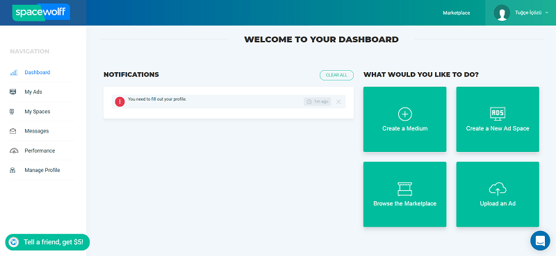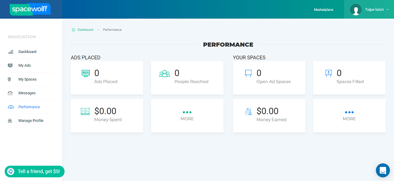 Panelde reklam alanları ve reklamlar için iki ayrı sekmeye yer verildiği görülüyor. Dolayısıyla reklam verenler ve reklam alanı sahipleri aynı panel üzerinden hareket ediyor. Aynı zamanda "performance" sekmesine de sahip olan Spacewolff görünen o ki, reklam alanlarının ölçümlenebilir olmasını da oldukça önemsiyor.