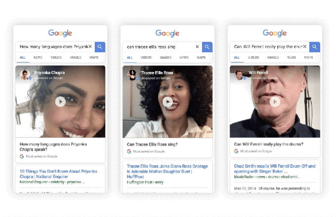 Google, mobil aramalarında ünlülerin ya da tanınmış simaların kendileri hakkında sorulan soruları cevaplamasını sağlayan bir özellik geliştirdi. Telefon kamerası "Selfie" modundayken verilen cevaplar, izleyenlerin kendini samimi bir diyalog içinde hissetmesini sağlıyor. Şirketin bu konuda beraber çalıştığı isimler arasında ise Priyanka Chopra, Will Ferrell, Tracee Ellis Ross, Gina Rodriguez, Kenan Thompson, Allison Williams, Nick Jonas, Mark Wahlberg, James Franco, Seth MacFarlane, Jonathan Yeo ve Dominique Ansel yer alıyor.