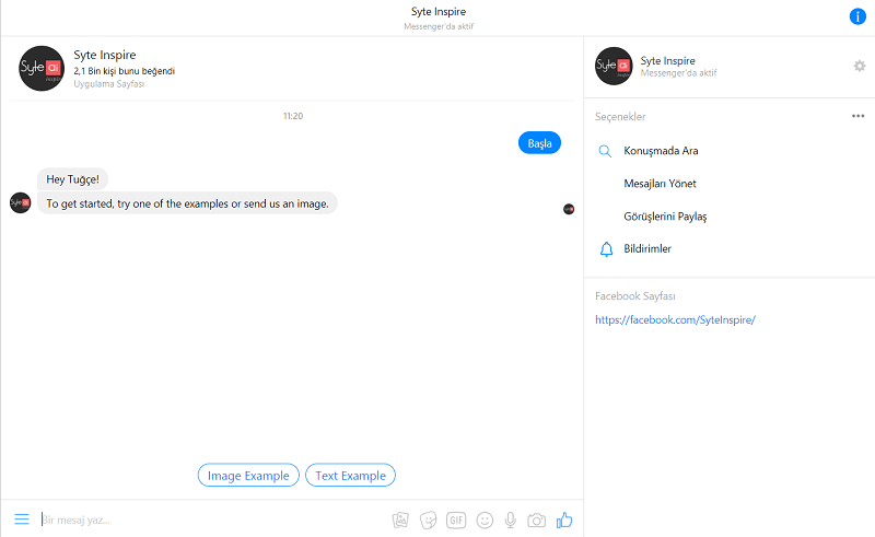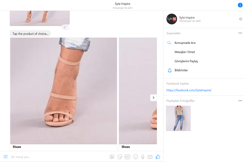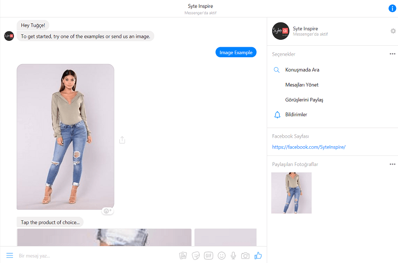Üstelik Syte.ai'ı sitenize yerleştirmeden önce Messenger ve Line üzerinde nasıl çalıştığını görebilirsiniz. Messenger üzerinde bir bot olarak hizmet veren Syte Inspire ile konuşmaya başladıktan sonra size öneride bulunmak için örnek bir görsel ya da metin seçmenizi istiyor.