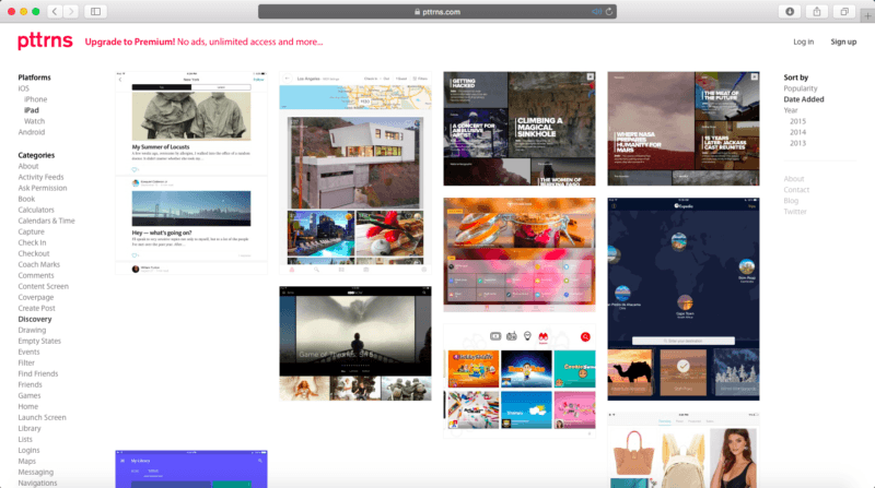 Pttrns, tasarımcıların fikir alabilmesi için farklı uygulamaların kullandıkları arayüzleri bir araya getiren bir platform. İşletim sistemi ve tasarımın amacına göre farklı kategoriler altında arama yaparak diğer uygulamaların benzer özellikler için nasıl tasarımlar kullandıklarını görebiliyorsunuz. Pttrns bu tasarımları ekran görüntüleri şeklinde sunuyor. Sınırsız erişimi için de ayda 4,99 dolar ödemeniz gerekiyor.