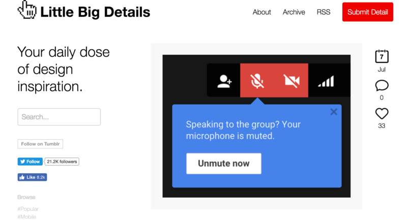 Little Big Details; günlük hayatta kullandığımız site, uygulama, platformların kullanıcı deneyimini artırmak için sundukları ufak detayları paylaşan bir site. Yaratıcılarının amacı, bu tür küçük detayları teşvik etmek. Little Big Details, sitelerin küçük detaylarla sağladıkları büyük kolaylıklar ya da hoşlukların toplandığı bir blog.