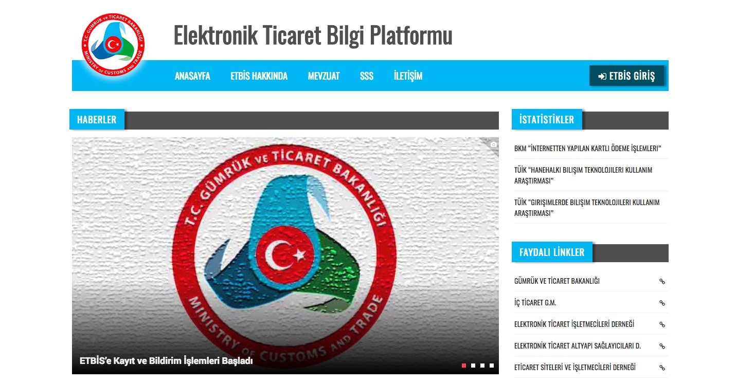 Gümrük ve Ticaret Bakanlığı bünyesinde oluşturulan Elektronik Ticaret Bilgi Sistemi (ETBİS), 1 Aralık 2017 tarihinde hizmete sunuldu. E-ticaret istatistiklerinin oluşturulabilmesi, e-ticaret sitelerinin ulaşılabilir olması, kayıtdışılığın ve dolandırıcılık risklerinin azaltılması için oluşturulan Elektronik Ticaret Bilgi Sistemi'ne 31 Aralık 2017 tarihine kadar tüm e-ticaret sitelerinin kayıt olması gerekiyor.