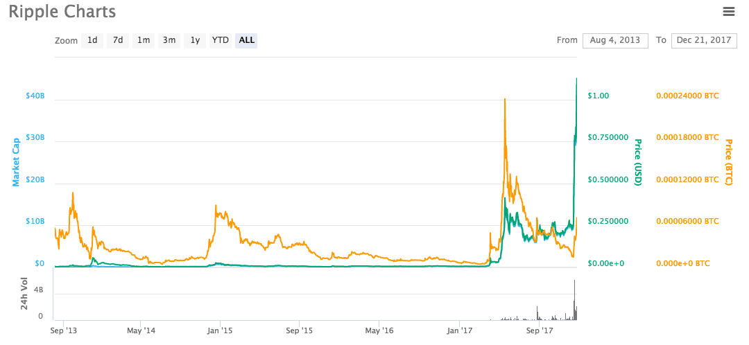 2012 yılından beridir kripto para piyasasında yer alan Ripple (XRP) kripto para dünyası için küçük fakat kendisi için büyük bir kilometre taşını geride bıraktı. 21 Aralık 2017 günü itibariyle ilk defa 1 dolar seviyelerini geçen Ripple, Coinmarketcap verilerine göre 1,16 dolara kadar çıktı. Bir diğer önemli detay ise piyasa değeri olarak 4. sırada bulunan Ripple'a sadece 1 hafta gibi kısa bir sürede 20 milyar dolar yatırım geldi ve yükseliş devam ediyor.