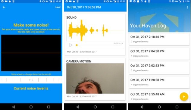 Dizüstü bilgisayarınızı bir otel kasasına kilitlediniz - kendi başına güvenli bir hareket değil - ve Haven yüklediğiniz telefonunuzu bunun üzerine yerleştirin. Birisi uzaktayken kasayı açarsa, telefonun ışık ölçeri aydınlatmada bir değişiklik tespit edebilir, mikrofonu sesi duyabilir, dizüstü bilgisayarınız hareket ettirilirse ivmeölçeri hareketi algılayabilir ve kamerası bile bu kişinin yüzünün bir fotoğrafını çekebilir. Haven uygulaması tüm bu kanıtları yerel olarak Android cihazına kaydeder.