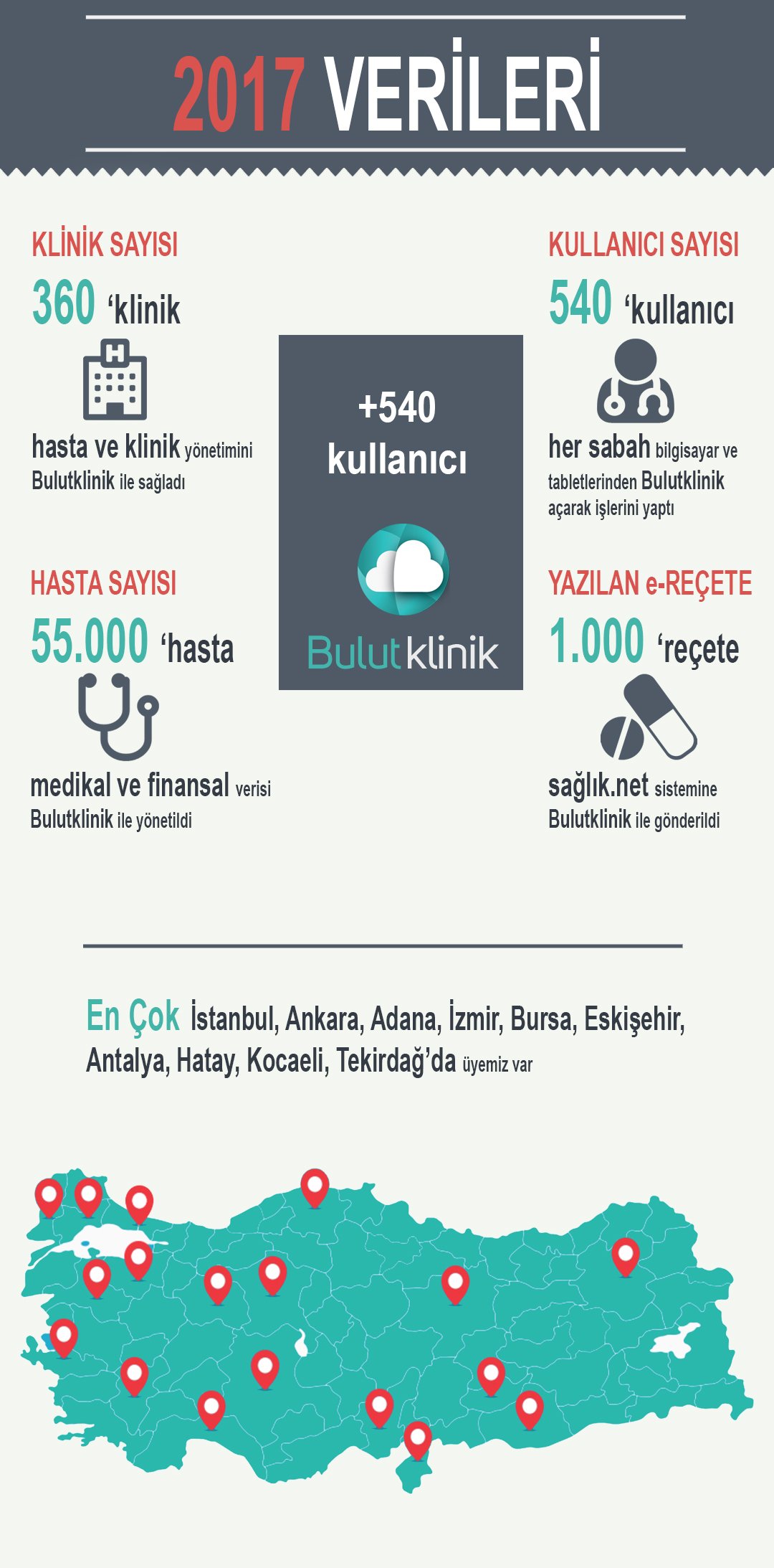 2017 yılında Sağlık Bakanlığı e-Reçete entegrasyonlarını da tamamlayan girişim, toplamda 1000'i aşkın e-Reçete yazılmasına aracılık etti. Ülkemizin pek çok noktasında hizmet veren Bulut Klinik, en çok İstanbul, Ankara, Adana ve İzmir şehirlerinde kullanıyor. En çok kullanılan şehirleri ise sırasıyla Bursa, Eskişehir, Antalya, Hatay, Kocaeli ve Tekirdağ izliyor.