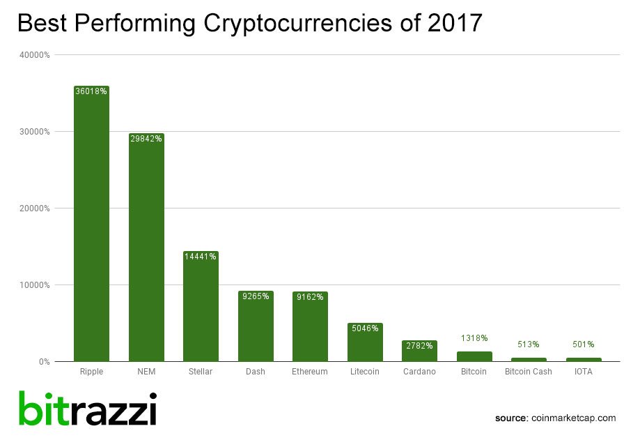 Coinmarketcap verilerine göre 2017 yılının en iyi performans gösteren kripto parası, yüzde 36.000 değer artışı yaşayan Ripple (XRP) oldu. En iyi performans gösteren ikinci kripto para yüzde 29.842 artış ile NEO olurken üçüncü sırayı yüzde 14.441 ile Stellar aldı. En büyük pazar payına sahip bitcoin yüzde 1.318 değer artışıyla bir çok kripto paranın gerisinde kalırken yine en büyük kripto paralardan biri olan Ethereum yüzde 9.162 değer artışı yaşadı.