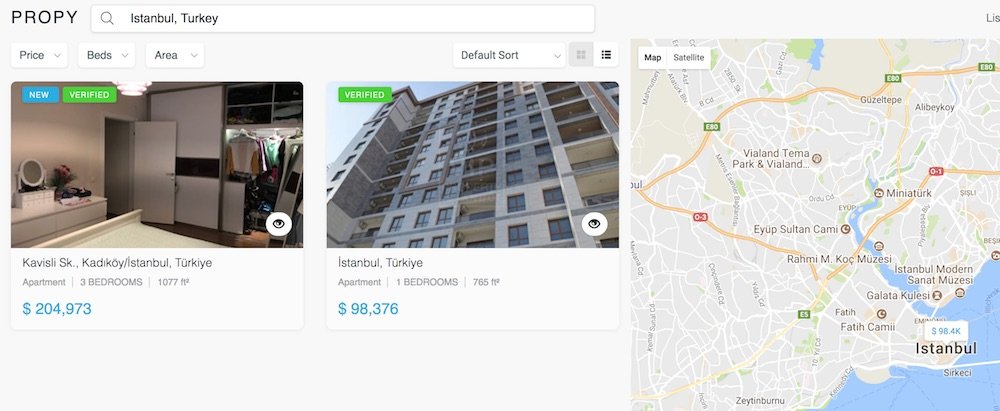 Propy'de hızlıca bir araştırma yaptığımda ilginç şekilde İstanbul'dan listelenmiş iki tane de emlak ilanı gördüm. Olası bir satış durumunda nasıl işlem yapacaklar çok hakim değilim ama evet birileri evlerini listelemişler bile.