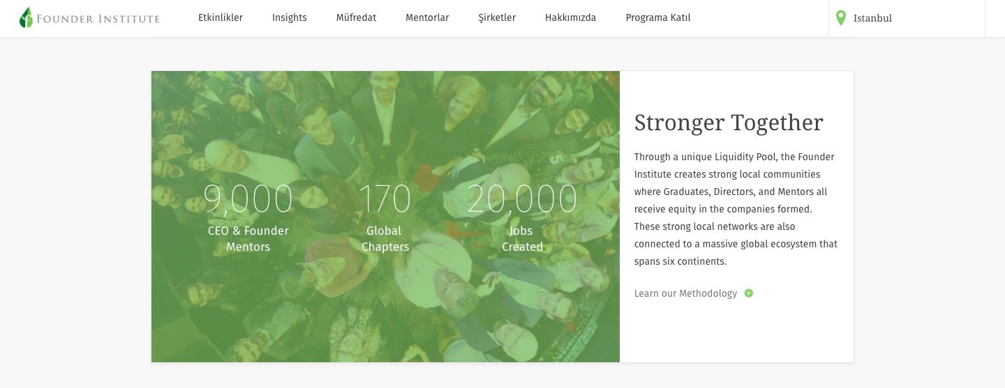 170'i aşkın şehirde hizmet veren Founder Institute, programını zorluğu nedeniyle kabul edilen girişimlerden sadece yüzde 20'sini mezun ediyor. Founder Institute İstanbul programının direktörlerinden Ali Erhat Nalbant'ın paylaştığı verilere göre şimdiye kadar açılan 5 dönemde 3000 girişimci / girişimci adayına ulaşılmış.