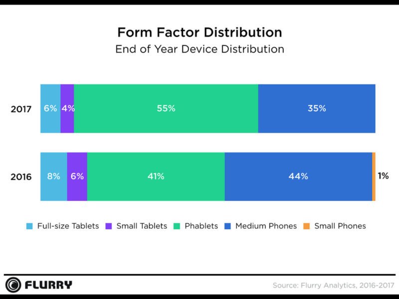Cihazlar üzerine de araştırma yapan Flurry, raporda diğer cihaz türleriyle karşılaştırıldığında yüzde 55 oranında en fazla kullanılan cihazın tablet telefonlar olduğunu öne sürüyor. Android üreticileri 2017'de tüm aktif cihazların üçte ikisini oluştururken, Apple tüm aktif cihazların yüzde 34'ü ile bireysel pazar payı elde ediyor.