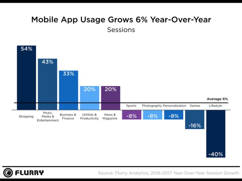 Uygulama pazarı büyümeye devam ediyor. Uygulamalardan kazanılan gelirler de bununla beraber artış göstermeyi sürdürüyor. Örneğin 2016’da 150 milyon dolar olan gelir elde eden mobil oyunlar bu rakamı 2017’de 158 milyon dolara taşıdı. Ancak Flurry'nin yayınladığı rapora göre 2016'dan 2017'ye kadar uygulamalarda gerçekleşen kullanıcı hareketleri sadece yüzde 6 oranında büyüme gösteriyor. Oysa yukarıda da belirttiğimiz gibi 2016'nın sonunda bu oran yüzde 11 civarında seyretmekteydi.