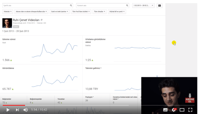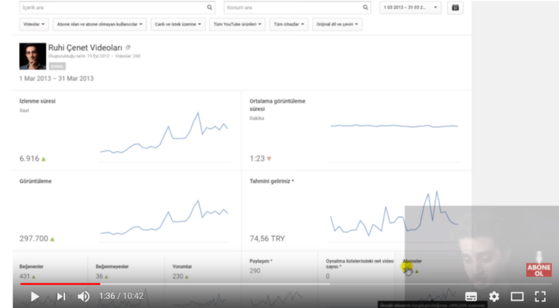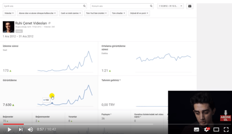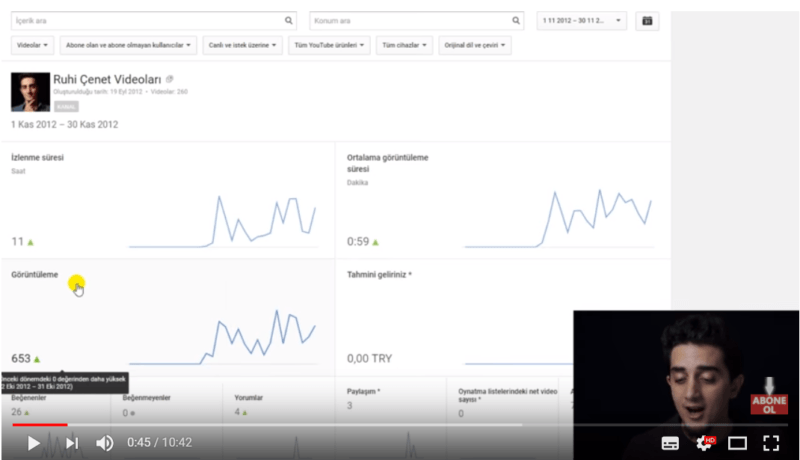 Ekim 2012'de YouTube kanalını açan Ruhi Çenet'in, Kasım 2012'de yüklediği 3-4 video ile 653 görüntülenmeye sahip olduğu görülüyor.