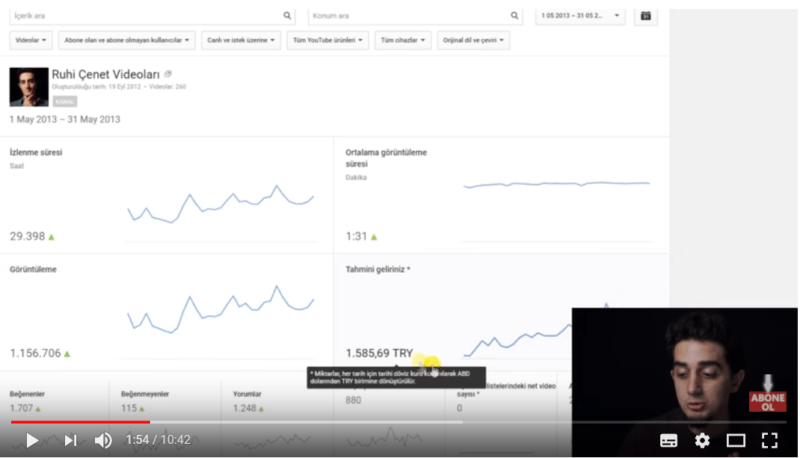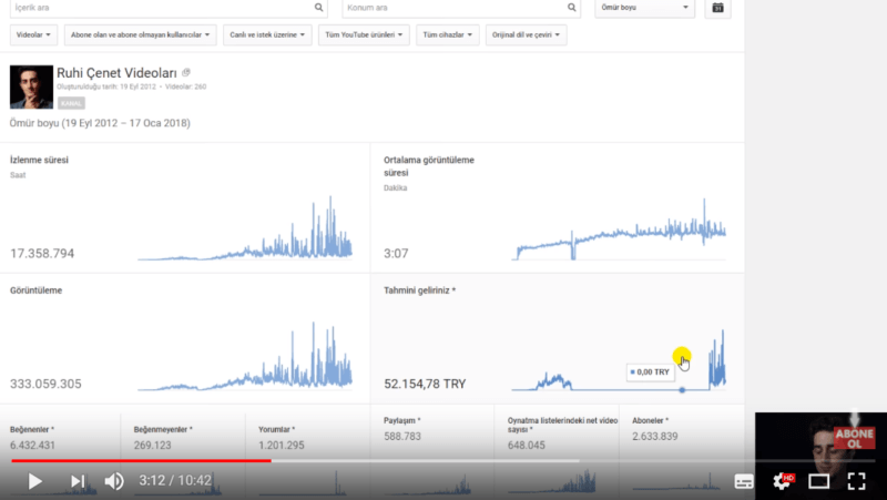 Başladığı tarihten bugüne kadar 333 milyon izlenme yakalayan, sadece YouTube reklamlarından 500 bin TL'ye yakın gelir elde ettiğini ifade ediyor. Üstelik bu gelirin için marka işbirlikleri ve sponsorluklar dahil değil. Çenet yukarıda gördüğünüz 52 bin rakamının ise doğruyu yansıtmadığını. O dönemde bir MCN firması ile çalıştığı için, çalışma sonlandığında raporların bir kısmının da silindiğini ifade etti. Bu arada YouTube üzerinden bin gösterime 1,40 kuruş kazanan Ruhi Çenet'in CPM bazlı kazanan medya kanallarının kazancını aştığını da söyleyelim.