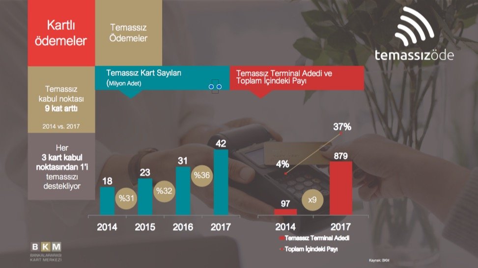 2016 yılında 68,4 seviyelerinde olan internetten yapılan kartlı ödeme tutarı 2017 yılında 99,1 milyar TL'ye çıktı. Mobil ödeme ise yükselişine devam ediyor. 2015 yılında yüzde 42 olan cep telefonu ile yapılan ödemeler, 2017 yılında yüzde 67'ye yükseldi. BKM'nin paylaştığı verilere göre yükselişte olan bir başka alan ise temassız ödemeler.