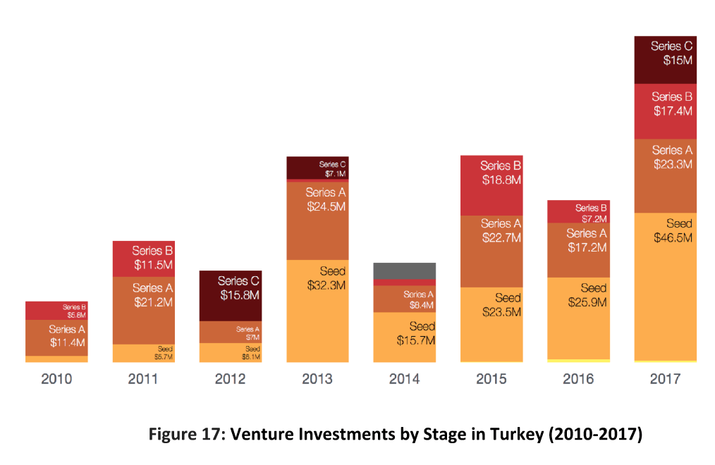 Türkiye özeline baktığımızda ise raporda girişim yatırımlarının 2017 yılında 177 milyon dolara çıktığına yer veriliyor. Çekirdek seviye yatırımlar 46,5 milyon dolarlık payla ilk sırayı alırken ikinci sırada Seri A yatırımları geliyor.
