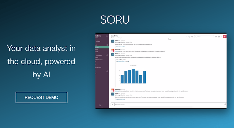 Örneğin Shopify mağazanızdan aldığınız satış verilerini SORU’ya verdiğinizde satış eğilimleriniz hakkındaki sorularınıza yanıt verebiliyor. Google Analytics, Google Adwords, Facebook, Mixpanel, Stripe, Salesforce gibi kanallardan aldığı verileri yorumlayan SORU, yanıtları da Slack platformu üzerinden veriyor.