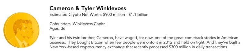 Listede 20 kişi ve 19 profil var. Forbes, Winklevoss ikizlerine tek profilde yer vermeyi tercih etmiş. Her bir kişiyi kısa biyografisi ve tahmini kripto değerini görebileceğiniz şekilde inceleyebilirsiniz.