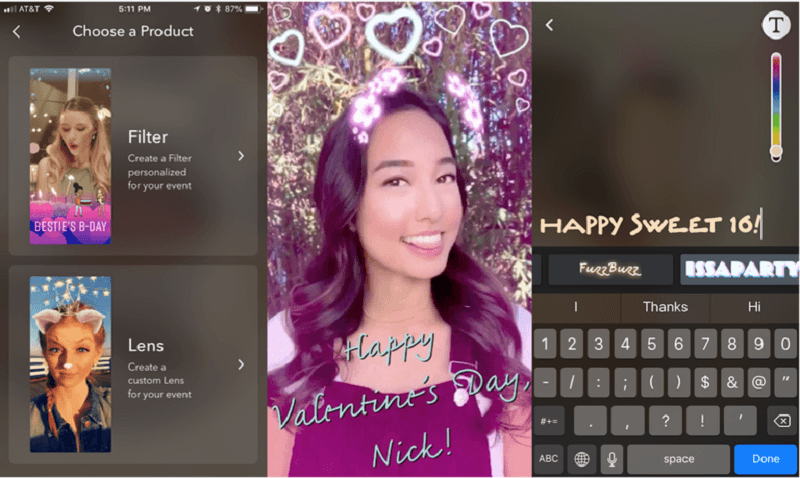 Kullanıcılar yüzlerine ışıltı, taç, gözlük ya da bir çift hayvan kulağı eklemek için 150 template arasından seçim yapabiliyor. Bu seçimi yaptıktan sonra ise "Mutlu Yıllar Aslı!" gibi kişiselleştirilmiş metinleri filtreye ekleyebiliyor. Geçtiğimiz hafta Brush, Italic, Glow, Gradient, Rainbow, Fancy ve Old English gibi bir çok yeni font ekleyen Snapchat, bu fontların kişiselleştirilmiş filtrelerde kullanılmasına da izin veriyor.