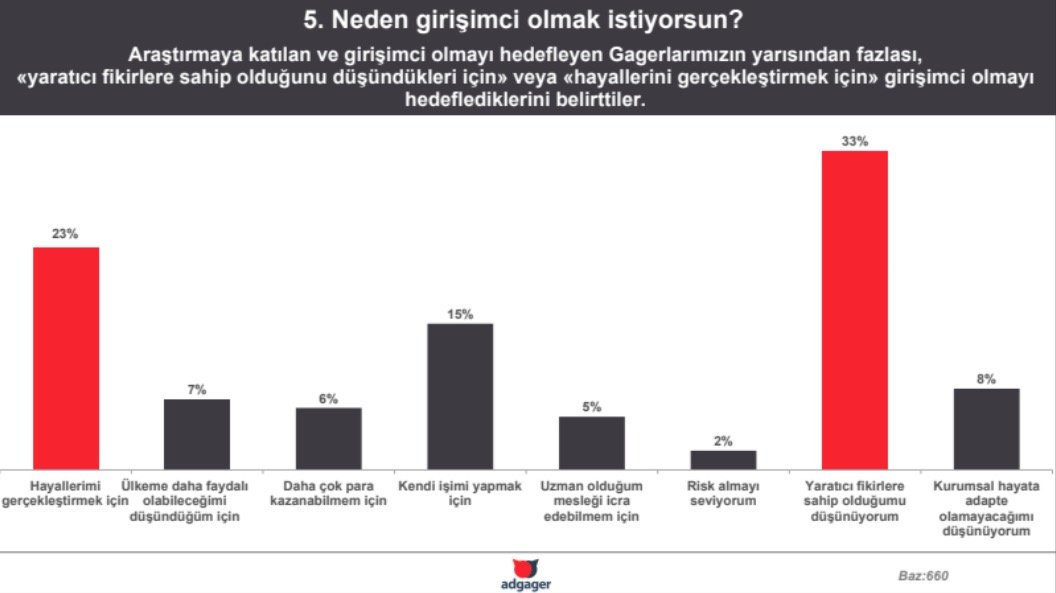 Girişimci olmayı hedefleyenlerin yüzde 33'ünün sektör içinde başarı elde edeceğine inandığı yaratıcı bir fikrinin olduğunu belirten rapor, öğrencilerin yüzde 75'inin girişimciliğin öğrenilebilir olduğunu düşündüğünü ve girişimcilik eğitimlerinin lise düzeyinde verilmesi gerektiğine inandığını gözler önüne seriyor. Girişimci olmak isteyen öğrencilerin yüzde 57'sinin girişim hedefi kendi işinin sahibi olmaktan geçiyor.