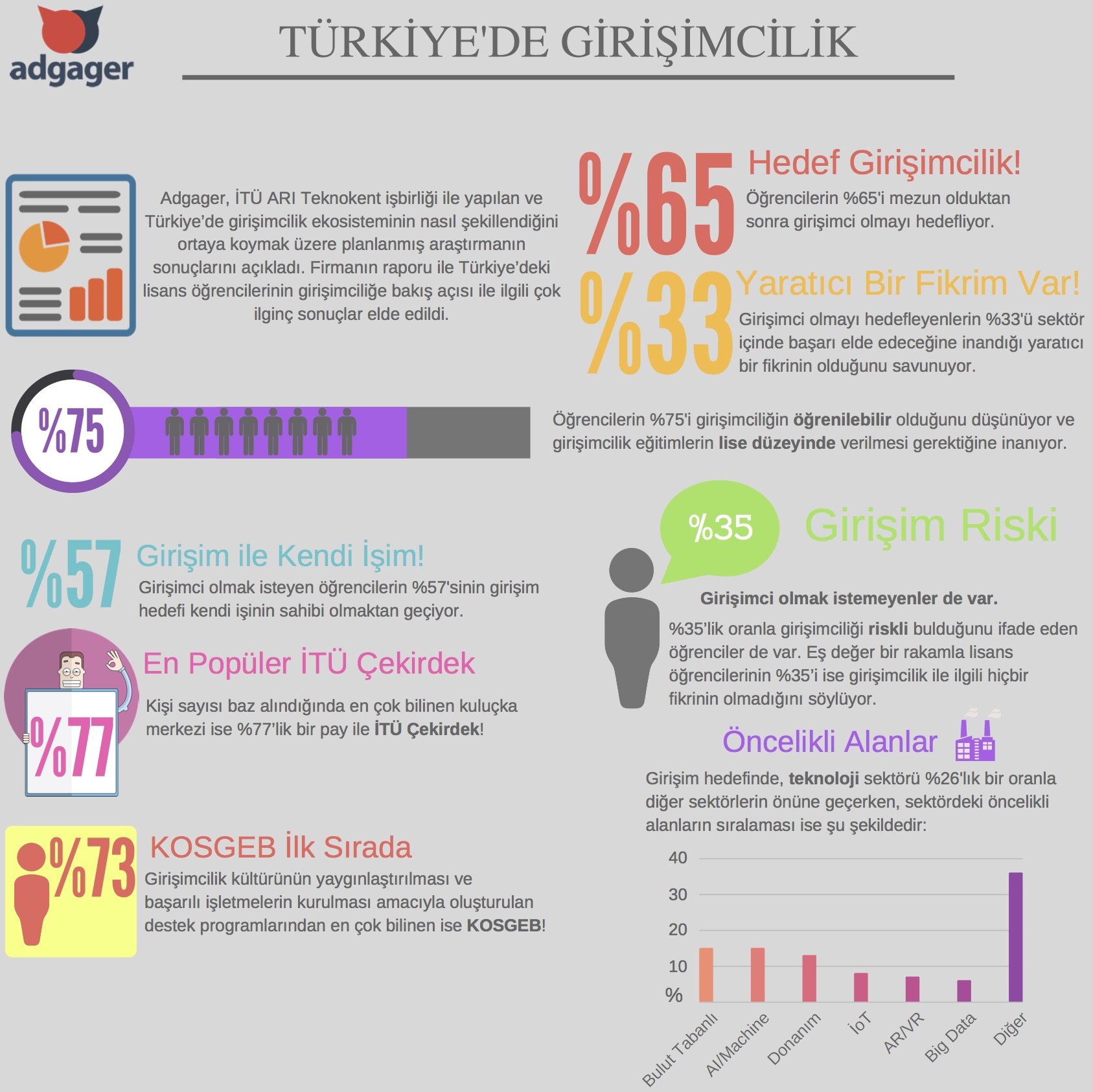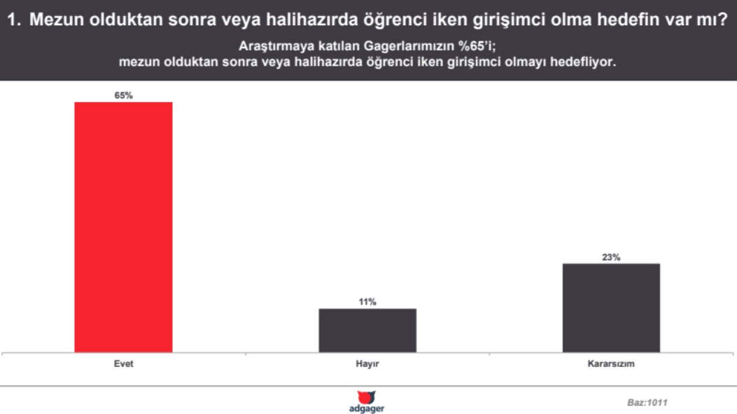 Adgager ve İTÜ ARI Teknokent'in iş birliği sonucunda karşımıza çıkan araştırma raporu, Türkiye'deki öğrenciler girişimcilik ekosistemine nasıl baktığını gözler önüne seriyor. Türkiye’de girişimcilik ekosisteminin nasıl şekillendiğini ortaya koymak üzere planlanan araştırma, Türkiye’deki lisans öğrencileri ile hazırlandı. 1011 lisans öğrencisinin katılımıyla oluşturulan rapora göre öğrencilerin yüzde 65'i mezun olduktan sonra girişimci olmayı hedefliyor.