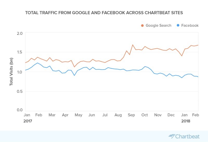 Bu arada Chartbeats, bir araştırma yayınladı. Araştırmaya göre Google, dijital yayın kuruluşlarına daha fazla trafik gönderirken, Facebook'un trafik gönderiminde ciddi düşüşler gözlemlendi.