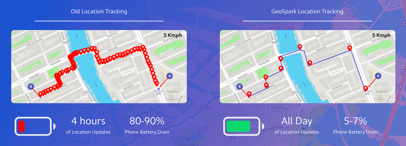 Konum takibi yapan GeoSpark, kullandığı akıllı sistem sayesinde geleneksel teknolojilere oranla bataryayı %90 oranında koruyor. Daha somut örneklemek gerekirse 5 saat açık kullandığınız bir konum takibi uygulaması bataryanızın %85'ine yakınını tüketirken, aynı özelliklere sahip GeoSpark altyapısını kullanan bir uygulamayı kullanırsanız 5 saatin sonunda bataryanızın yaklaşık 6'sı kullanılmış olur.