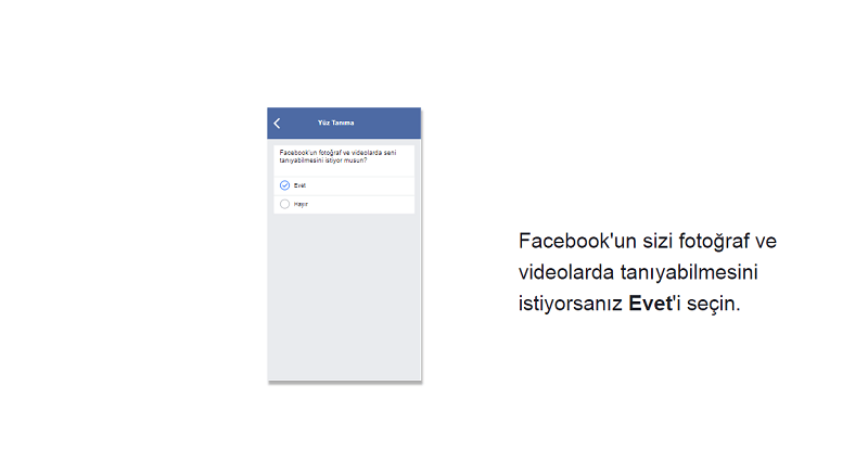 Karşınıza çıkan bu bilgilendirme metninde Ayarlara Git'e basarsanız doğrudan Yüz tanıma ayarlarına yönlendiriliyorsunuz. Bu bölümde yer alan "Facebook'un fotoğraf ve videolarda seni tanıyabilmesini istiyor musun?" sorusuna ise evet ve hayır seçeneklerinden birini tercih ederek cevap verebiliyorsunuz.