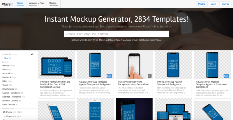 Placeit, site ya da uygulamanız için anında mockup oluşturmanızı sağlayan bir araç. Bir ekran görüntüsü ya da link yüklediğinizde istediğiniz her cihaz için mockup oluşturuyorlar. Şablonlarını sürekli güncel tutmaya çalışan Placeit’in ücreti, istediğiniz mockup sayısına göre ayda 29 ile 199 dolar arasında değişiyor.