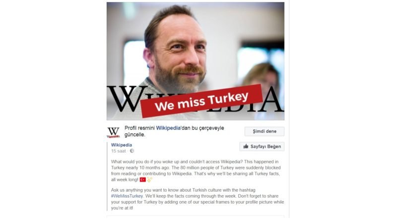 Profil resmini değiştirmeden önce 6 saat önce bir Facebook çerçevesi yayınlayan Wikipedia, çerçevenin açıklamasında 1 hafta boyunca Türkiye'deki gerçekleri yayınlayacağını açıkladı. Çerçevenin açıklamasında#WeMissTurkey hashtagiyle bir kampanya başlattığını duyuran kuruluş, "Türk kültürüyle ilgili bilmek istediğiniz her şeyi #WeMissTurkey hastagiyle sorun" ifadesine yer verdi.