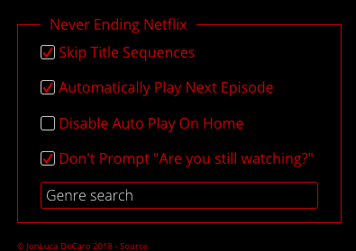 Netflix üzerinden dizi izlemeyi çok sevsek de zaman zaman hızlıca geçmeyen jenerikler ve intro'lar kabusumuz olabiliyor. JohnLuca DeCaro tarafından geliştirilen "Never Ending Netflix" eklentisi sayesinde artık böyle bir sorunumuz da kalmıyor. Intro'ları otomatik olarak geçen ve bir sonraki bölümü hızlıca başlatan Never Ending Netflix, aynı zamanda Netflix'te yer alan içerikler arasında kategoriler halinde arama yapmanıza da olanak sağlıyor.