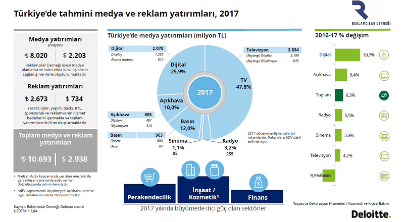 Reklamcılar Derneğinin on yıllardır paylaştığı raporun bu yıl ilk kez bağımsız danışmanlık şirketi Deloitte işbirliğiyle hazırladığını da belirtelim. Reklamcılar Derneği, toplantıda Medya ve Reklam Yatırımları raporunu bu yıl itibariyle yeni bir metodoloji ile hazırladığını da duyurdu. 2017 Medya ve Reklam Yatırımları Raporu, Reklamcılar Derneği üyesi medya planlama ve satın alma ajanslarının verileri ile birlikte RTÜK başta olmak üzere diğer sektör-medya örgütlerinden sağlama amaçlı veri toplanarak oluşturuldu.