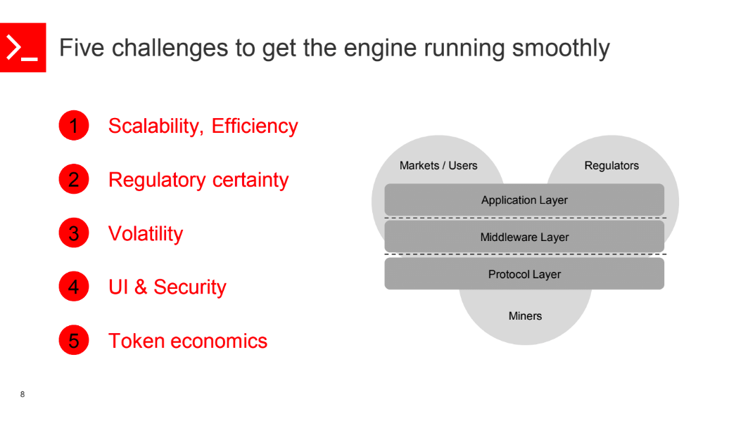 Blockchain teknolojisinin pazar/kullanıcılar, regülatörler ve madencilerden oluştuğunu belirten Kurani, teknolojinin başarılı bir şekilde çalışması için 5 önemli etken olduğunun altını çizdi. Söz konusu etkenler ise ölçeklenebilir yapı, regülasyon kesinliği, uçuculuk (Volatility), güvenlik ve token ekonomisi.