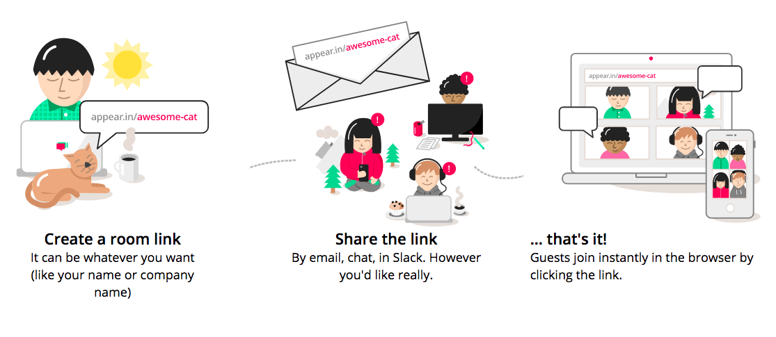 2013 yılından beri hizmet veriyor olmalarına rağmen Appear.in adını duymadığım bir girişimdi. Almanya'da yaşayan bir arkadaşımdan gelen bir link ile video görüşmeye süper hızlı bir şekilde dahil olunca bu girişimden haberim oldu. Gerçektende şimdiye kadar gördüğüm en hızlı ve kolay video konferans görüşmesini sağladık ve daha önce tekrar tekrar kullanmaya devam ettik.